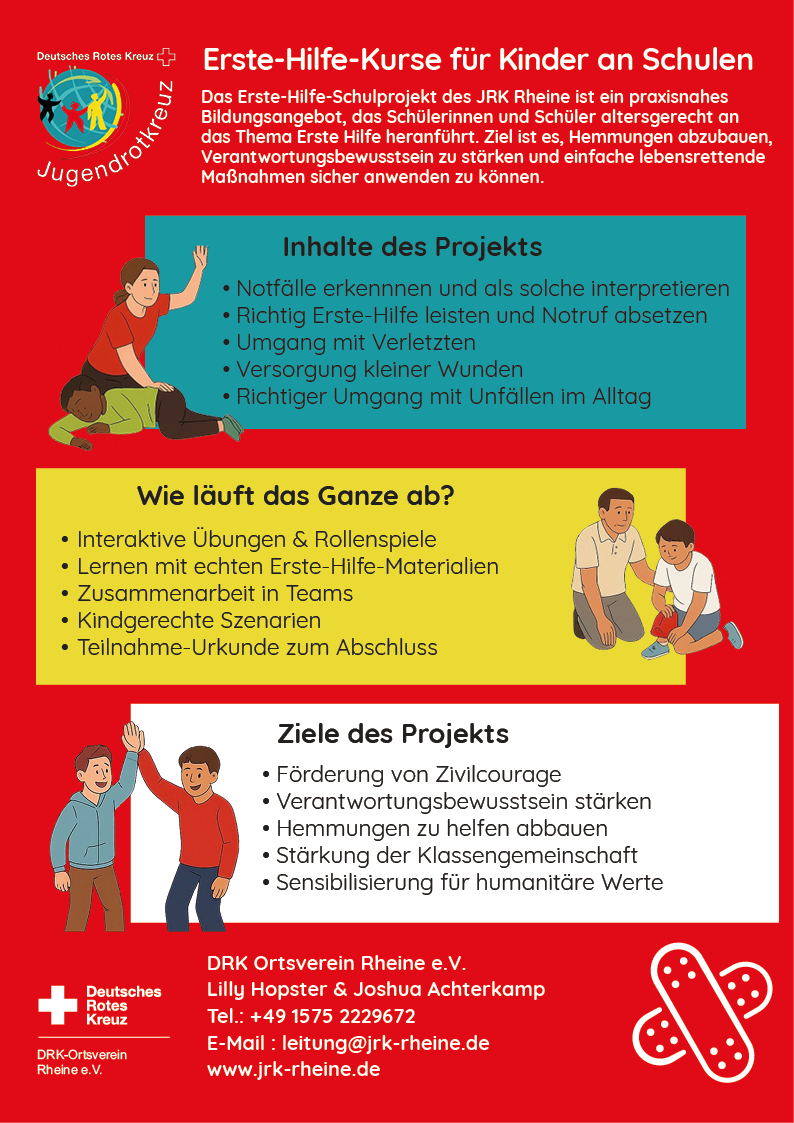 Das Erste-Hilfe-Schulprojekt des JRK Rheine bietet Kindern und Jugendlichen die Möglichkeit, altersgerecht und praxisnah zu lernen, wie sie in Notfällen richtig handeln können. Ziel des Projekts ist es, Hemmungen abzubauen, Verantwortungsbewusstsein zu fördern und einfache lebensrettende Maßnahmen sicher anzuwenden – wie zum Beispiel das Absetzen eines Notrufs, das Versorgen kleinerer Wunden oder die stabile Seitenlage.